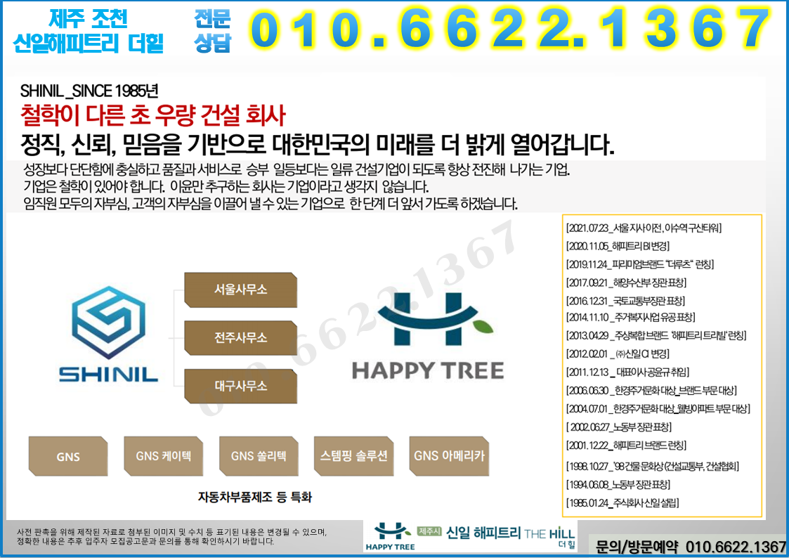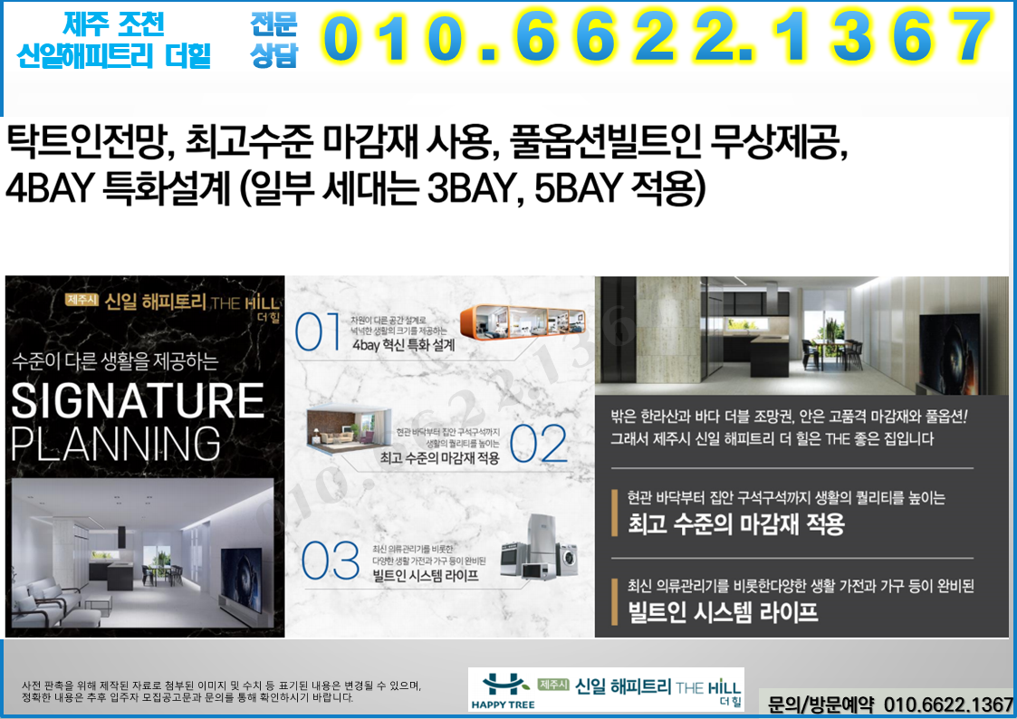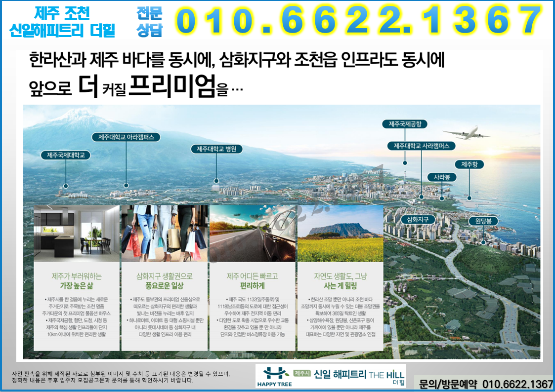 또한 6월 분양가 더 오른다는 소식 들으셨을 것입니다. '제주 신일해피트리 더힐' 분양가 3억 2900만원 부터 시작합니다. 여기에는 확장비 무상, 빌트인 가전 무상이고, 수입 천연 대리석 마감된 부분이 선택이 아니라 기본으로 제공됩니다. 제주 집값 비교해 보실 때 편하게 '제주 신일해피트리 더힐' 에 대해 문의 주세요. (클릭)