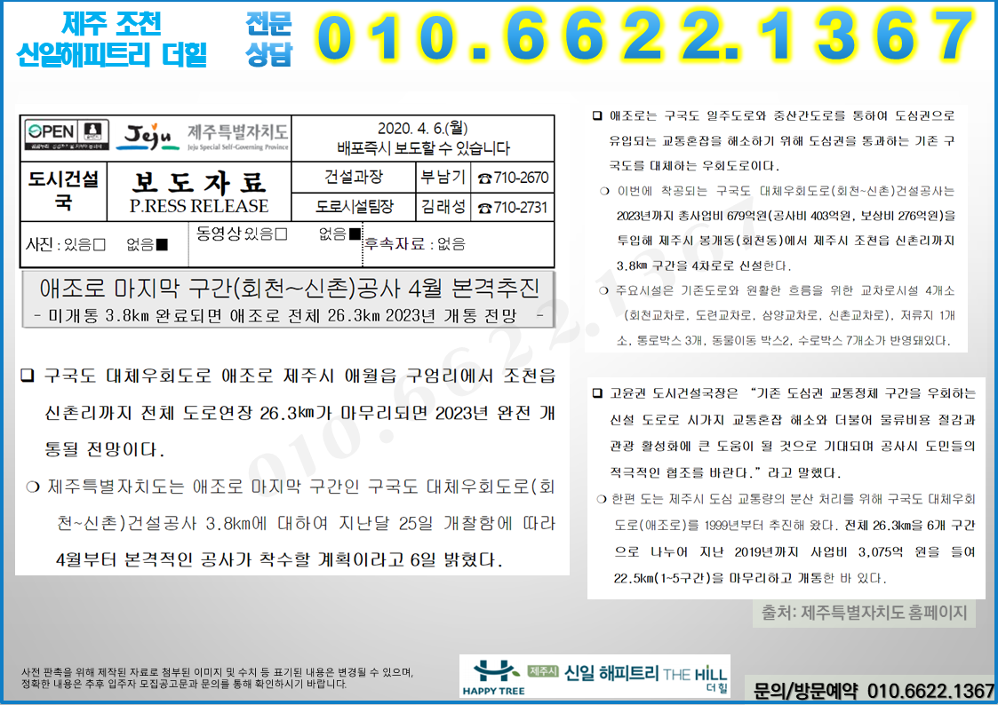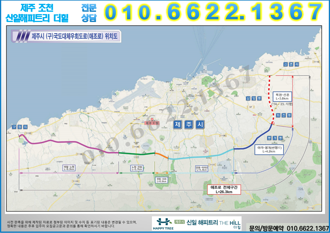 애조로 (애월-조천) 마지막 구간인 회천-신천 구간이 바로 '제주 신일해피트리 더힐' 이 있는 곳입니다. 현재 공사중으로 입주(2023.7예정) 전 개통 될 것으로 보입니다. 거기에 최고 수준의 마감자재를 사용했기에 제주에 집을 구하신다면 세컨하우스, 실거주 or 투자 로도 좋습니다 .