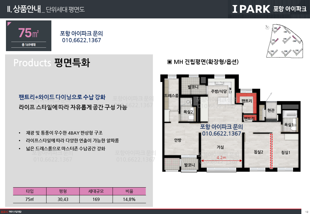 '포항 아이파크 세대수 및 평면도' 를 보시면 전 세대 모두 4베이 구조로 특화 설계되어 있는 것을 볼 수 있습니다. 75타입은 총 168세대로 이루어져 있습니다.