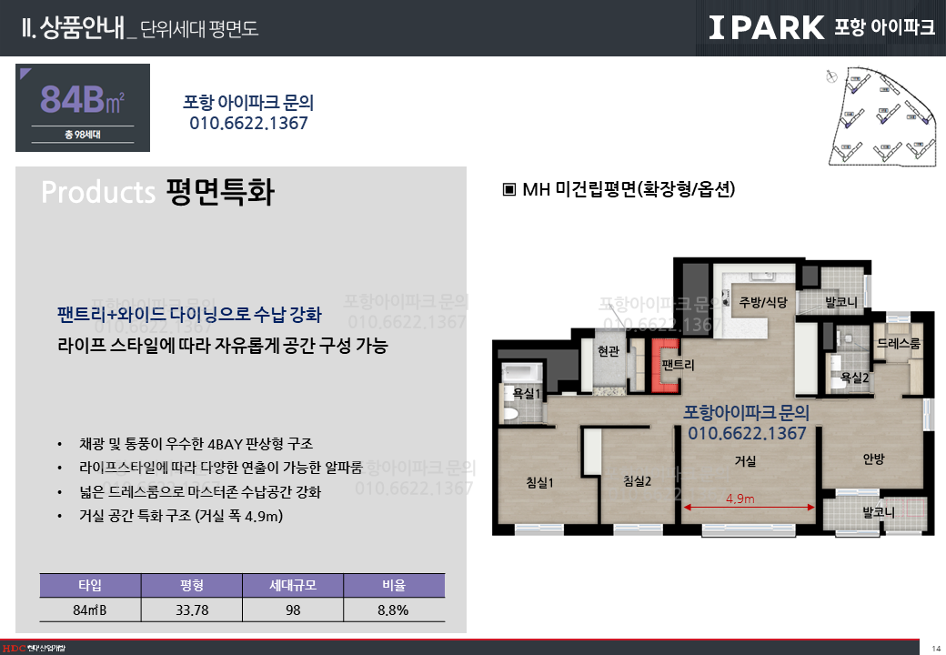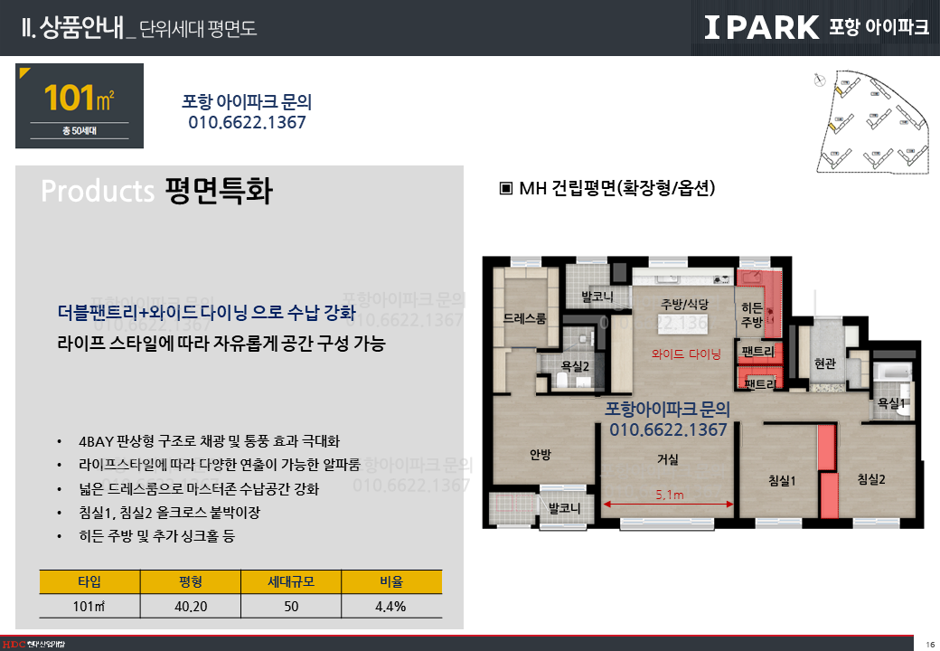 포항 아이파크 청약 경쟁률 가장 높은 타입인 101 타입은 보다 넓은 공간을 위한 50세대가 준비되어 있습니다. 다양한 연출이 가능한 알파룸과 넓은 드레스룸으로 마스터존 수납공간 강화 그리고 침실1, 2에 마련된 올크로스 붙박이장, 히든 주방 및 추가 싱크홀 등이 있습니다.