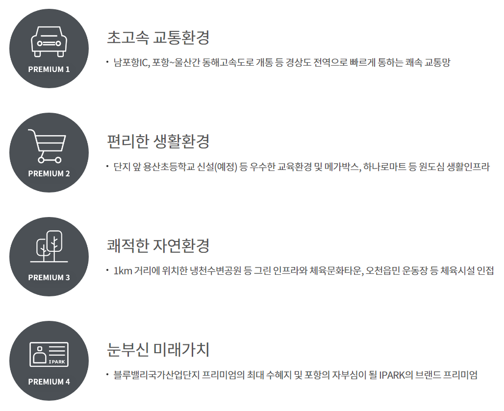 '포항 아이파크 프리미엄' 은 초고속 교통환경, 편리한 생활환경, 쾌적한 자연환경, 눈부신 미래가치가 있습니다. 상세하게는 남포항IC, 포항~울산간 동해고속도로 개통 등 경상도 전역으로 빠르게 통하는 쾌속 교통망, 단지 앞 용산초등학교 신설(예정) 등 우수한 교육환경 및 메가박스, 하나로마트 등 원도심 생활인프라, 1km 거리에 위치한 냉천수변공원 등 그린 인프라와 체육문화타운, 오천읍민 운동장 등 체육시설 인접, 블루밸리국가산업단지 프리미엄의 최대 수혜지 및 포항의 자부심이 될 아이파크 IPARK의 브랜드 등 입니다.